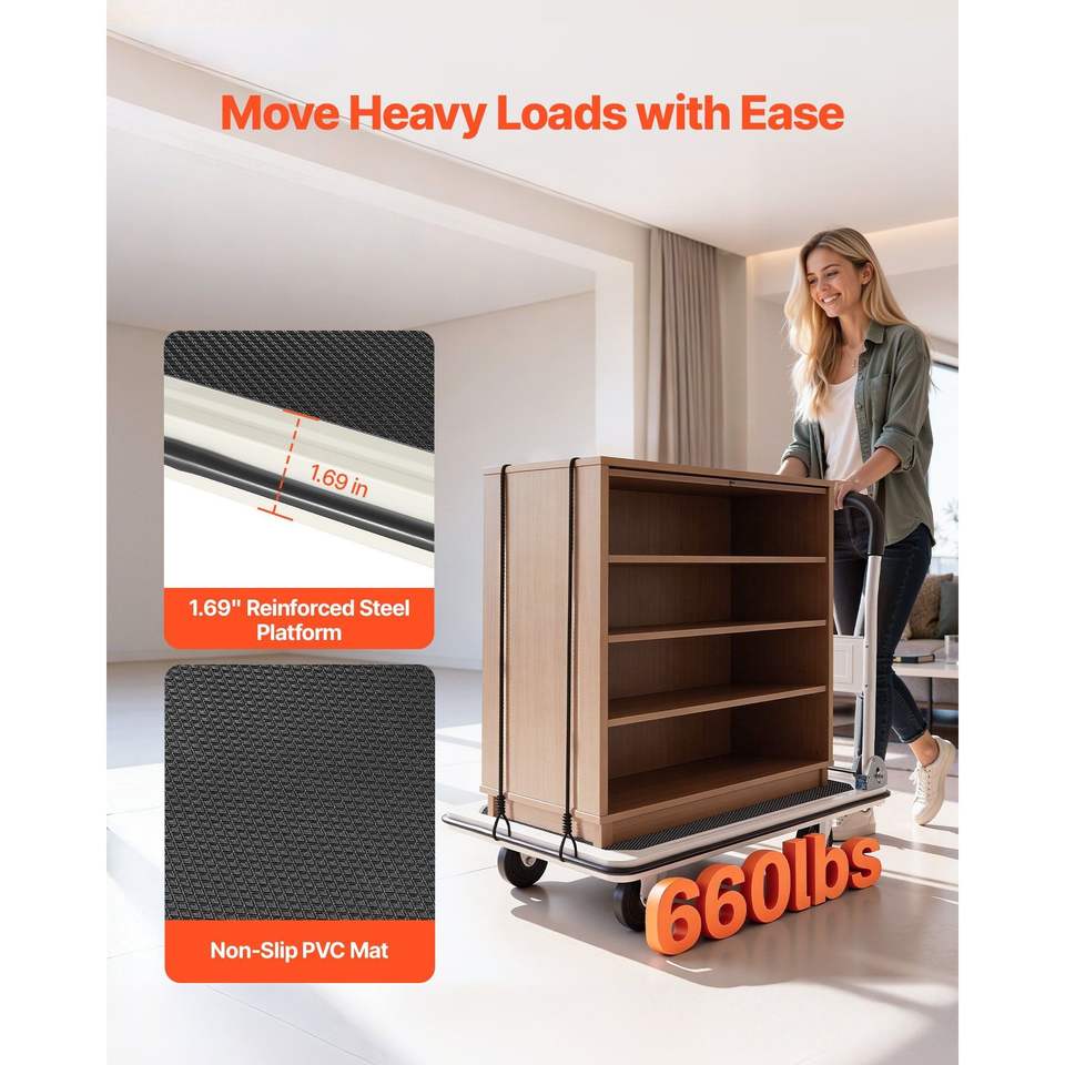 Carretilla Plegable con Capacidad de Carga de 660 Libras, Plataforma Plegable con Ruedas Giratorias, Carretilla de Mano y Carretillas con Plataforma Plana
