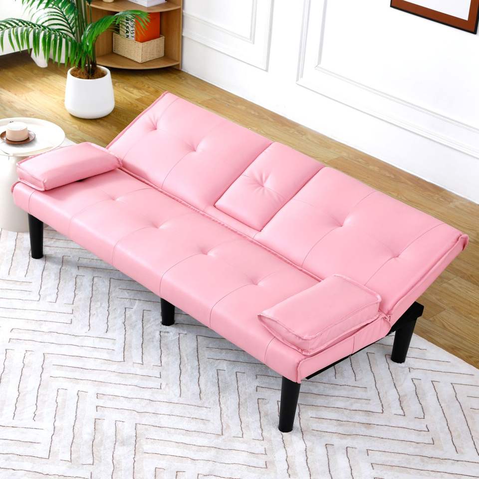 Sofá cama multifuncional de PVC rosa de 67 pulgadas con portavasos plegable para convertir la sala de estar en habitación de invitados
