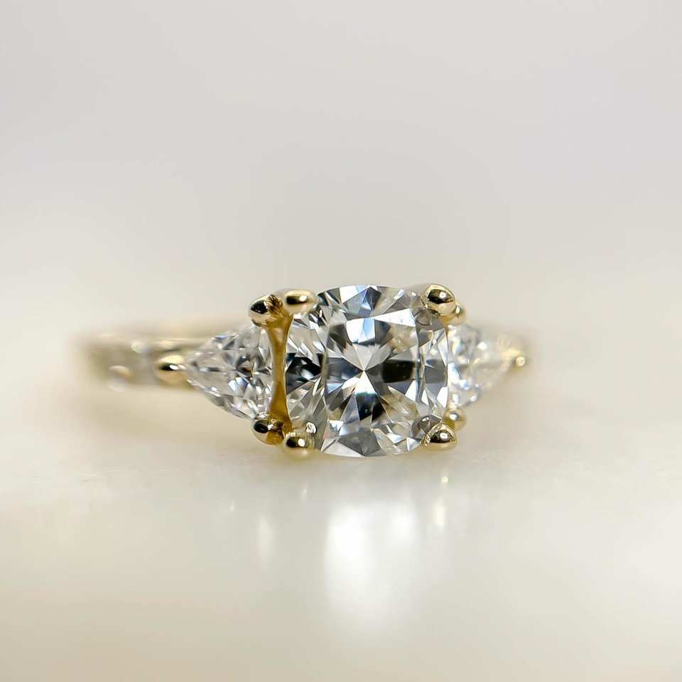 Anillo de compromiso de diamante de moissanita con corte de cojín de 6mm | Piedras laterales trapezoidales Pave Band | Plata de Ley 18K chapado en oro minimalista