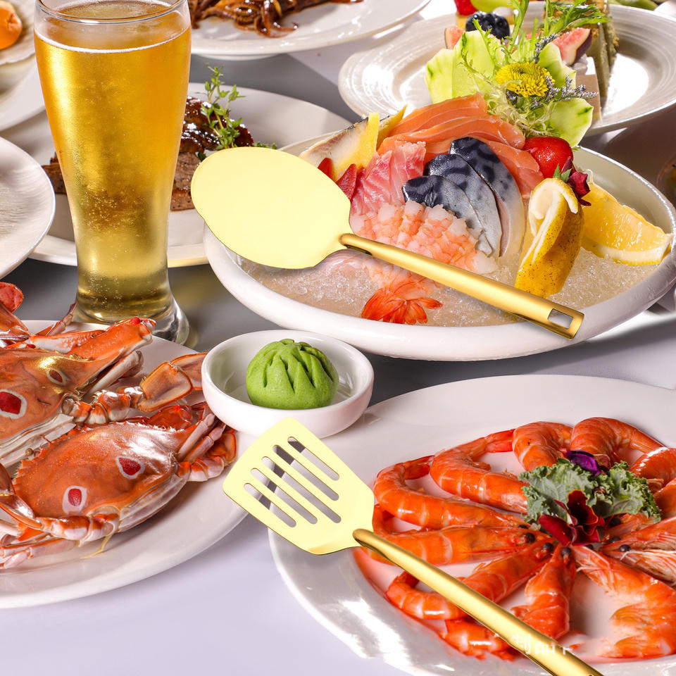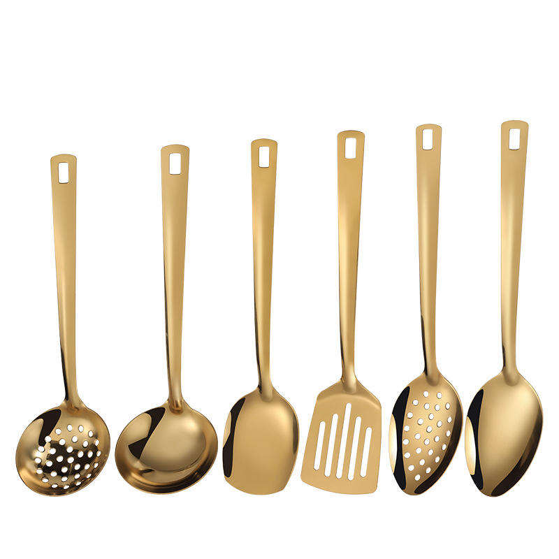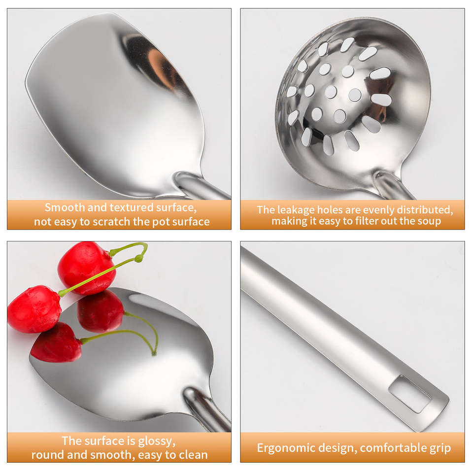 Juego de 6 utensilios de cocina de acero inoxidable de gran venta: cuchara para freír, espátula plana, cuchara para sopa, colador y espátula.