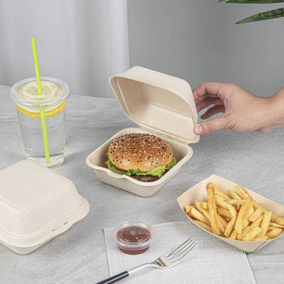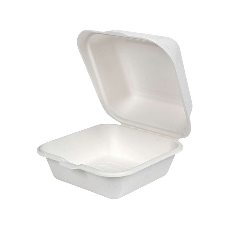Contenedor de comida desechable tipo clamshell de bagazo de caña de azúcar de 6x6 pulgadas, ecológico, biodegradable, para llevar.