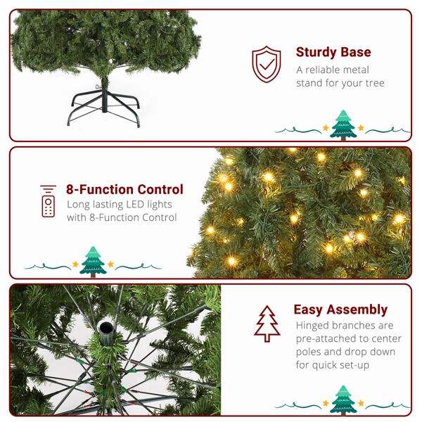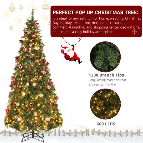Árbol de Navidad Automático de PVC de 7.5 pies con 600 Luces Cálidas y 8 Modos, 1200 Ramas Verdes