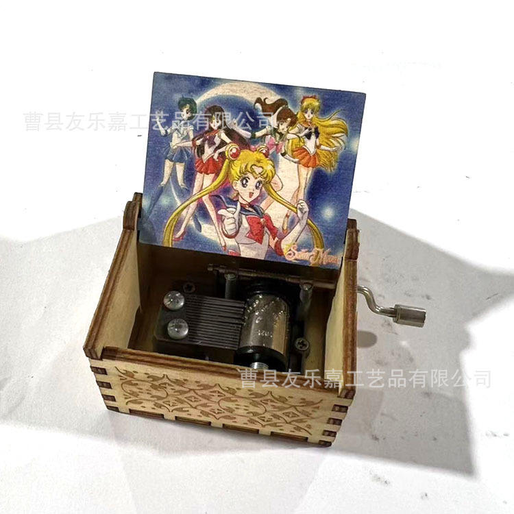 7 diseños regalo Popular melodía manivela de mano grabado con láser manivela de mano 6CM tamaño Mini Sailor Moon caja de música de madera juguete para niños