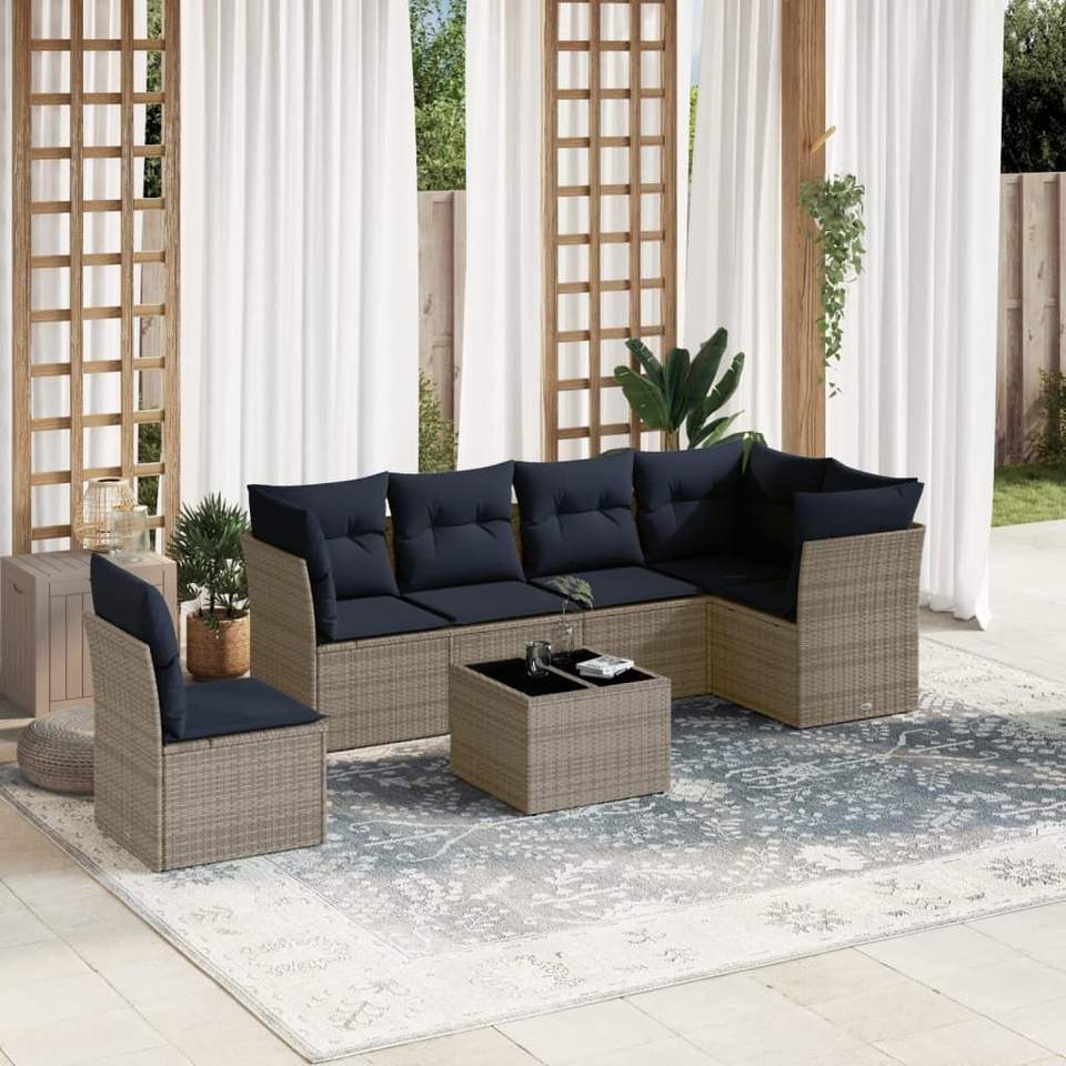 Juego de sofás de jardín de ratán sintético gris de 7 piezas con cojines, muebles de exterior, diseño contemporáneo