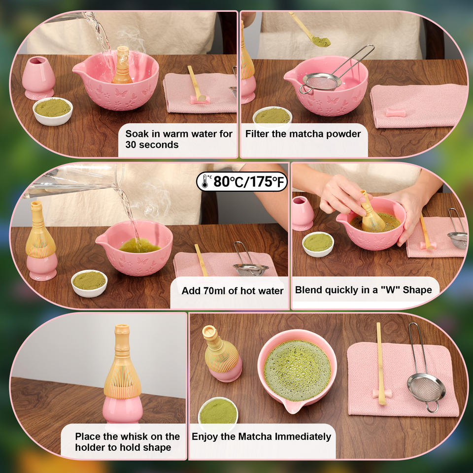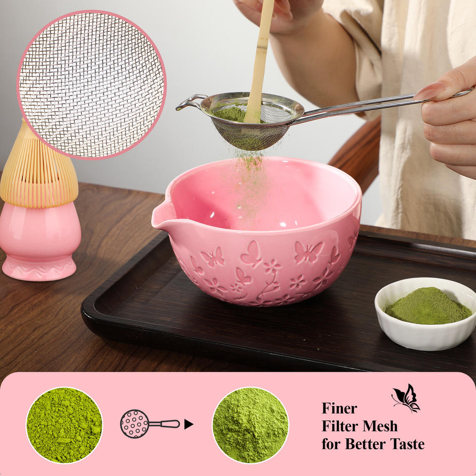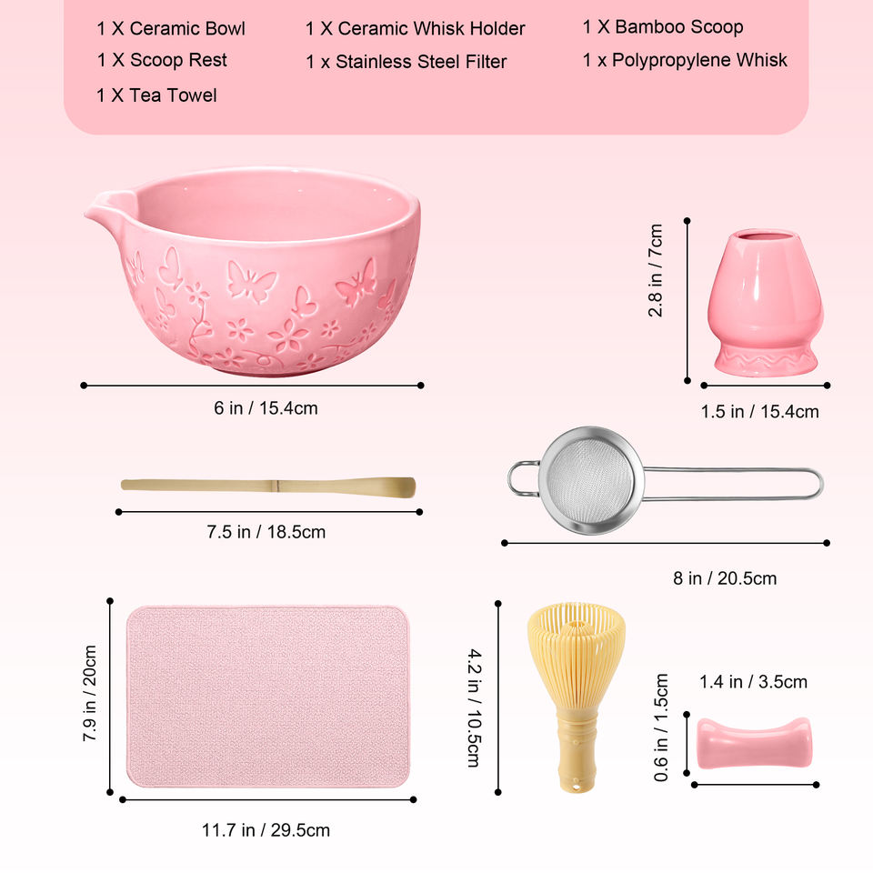 Juego de Té Matcha Japonés de 7 Piezas, Tazón de Cerámica Rosa con Diseño de Mariposa y Batidor de PP para la Ceremonia Tradicional del Té