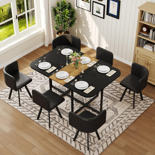 Juego de Comedor Moderno de 7 Piezas con 6 Sillas de Cuero PU Negro, Muebles de Comedor Ecológicos y Duraderos para Espacios Pequeños