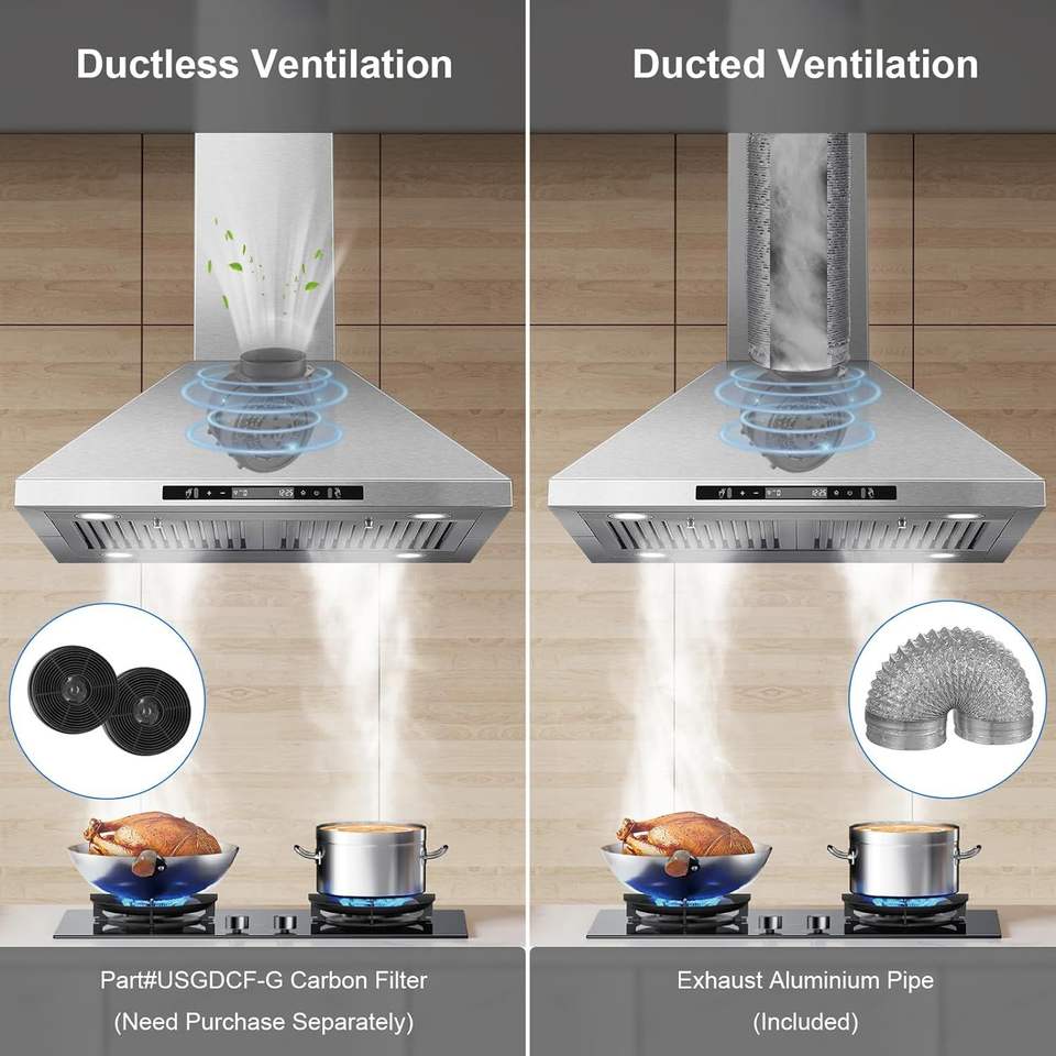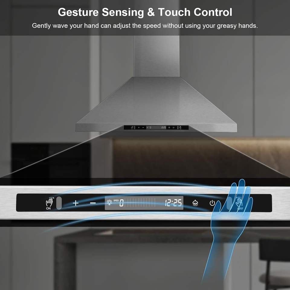 Campana Extractora de Techo de 700 CFM para Cocina, Campana Extractora de Isla de 30 Pulgadas con 4 Luces LED, Ventilador de 3 Velocidades, Control Táctil/Gestual, Convertible