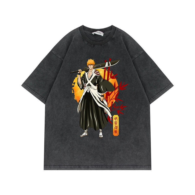 Camisetas Personalizadas de 700 Diseños, Fabricantes de Camisetas de Algodón Negro Grueso con Lavado Ácido, Estilo Vintage, Camiseta de Anime BLEACH para Hombre