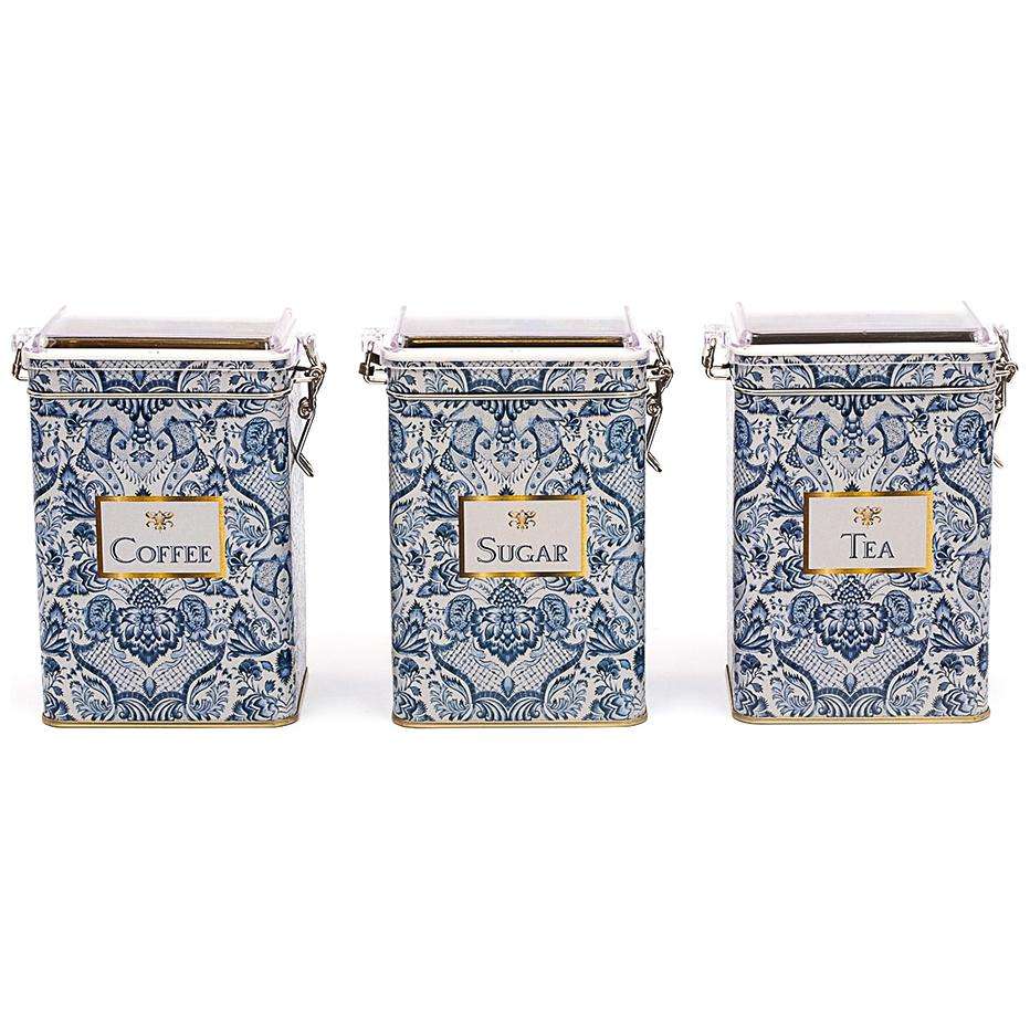 Juego de cajas de metal rectangulares de 75x100x150mm (Juego de 3) Cierre de alambre y tapa transparente Decorativo azul y blanco inspirado en azulejo