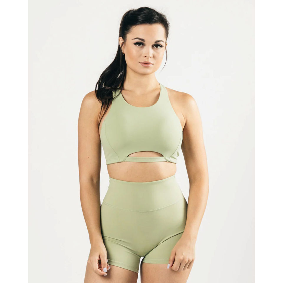 Sujetador Deportivo de Yoga de Una Pieza para Mujer, 78% Nailon, 22% Elastano, Cuello Alto, Espalda Deportiva, Logotipo Frontal, Dobladillo Sin Costuras, Soporte Medio, Color Matcha