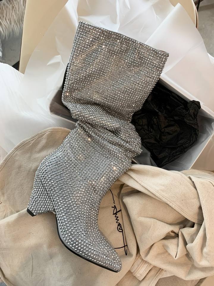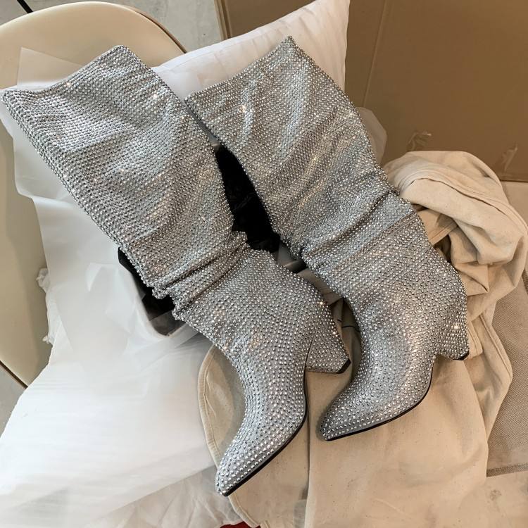 Botas de tacón grueso de 7 cm con diamantes de imitación personalizadas hasta la rodilla para mujer, ideales para damas sexys.