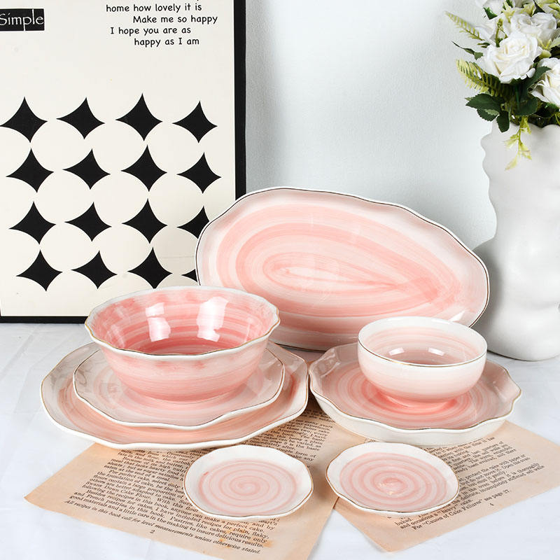 Juego de Vajilla de Cerámica Rosa Galaxia de 7 Piezas con Borde Dorado Hecho a Mano y Superficie Esmaltada, Apto para Microondas y Lavavajillas
