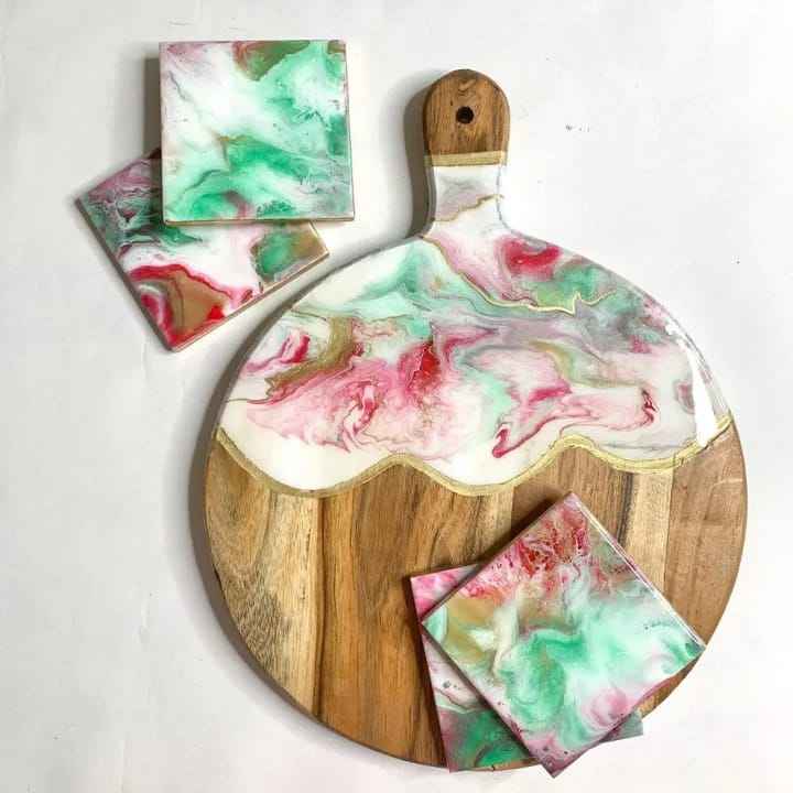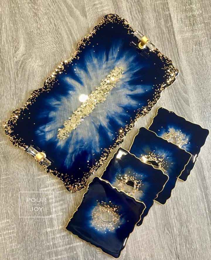 Juego de 7 piezas de resina turquesa con asas de hoja de oro, bandeja de ágata irregular y posavasos a juego para fiesta de té