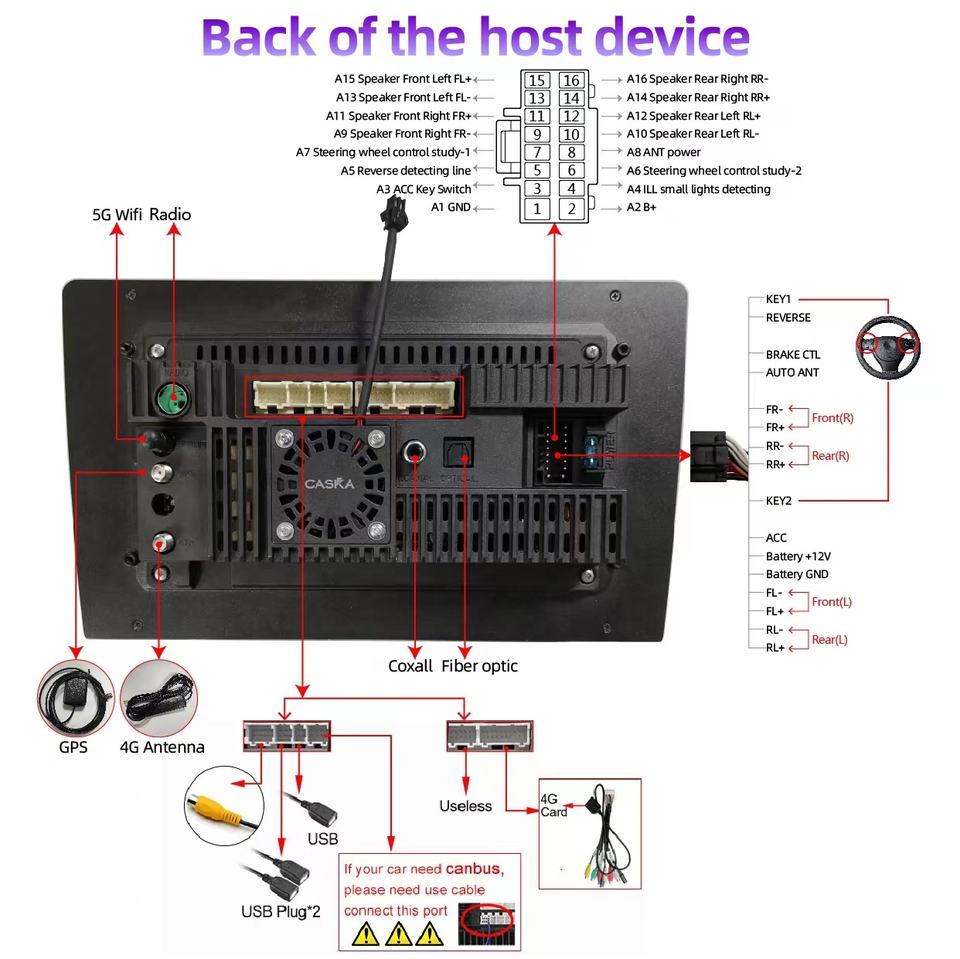 Conexión:Construido en WiFi, Usb, Tarjeta SIM integrada/externa, antena 4G, Altavoz de potencia, Antena de radio, Antena BT/WIFI, Reversión, antena GPS, radiocontrol