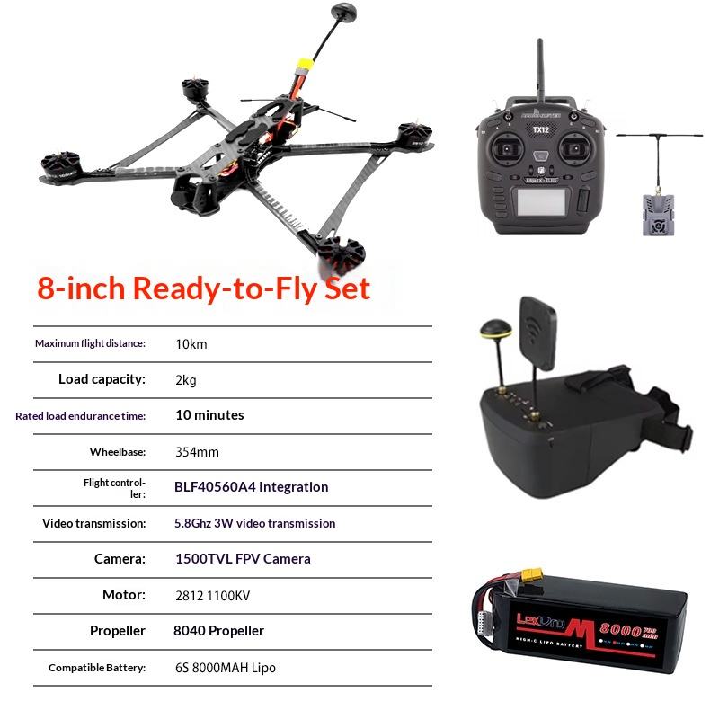 Quadcopter de Carreras FPV de 8 Pulgadas, Combo 5 en 1 FPV-0800-5IN1, 5.8G 3W VTX, Carga Útil de 2KG, Alcance de 10KM, ELRS 915, RTF