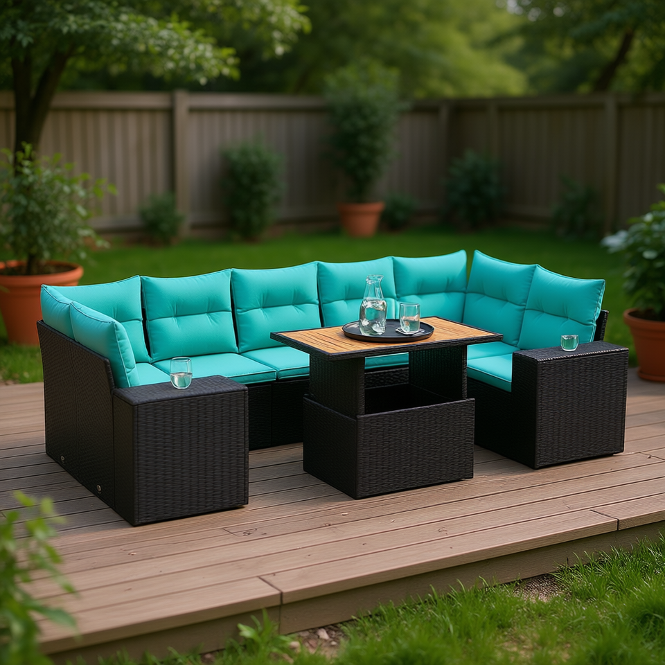 Juego de sofás de patio de ratán sintético negro de 8 piezas con cojines, muebles de exterior, asientos de estilo contemporáneo para 8 personas