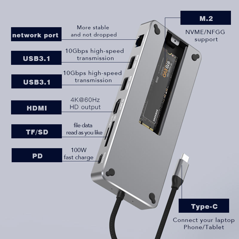 Tipo C, Tarjeta SD, Tarjeta Micro SD, USB-C, PD, Puerto LAN, Tarjeta TF, HDMI 2.0, USB3.1