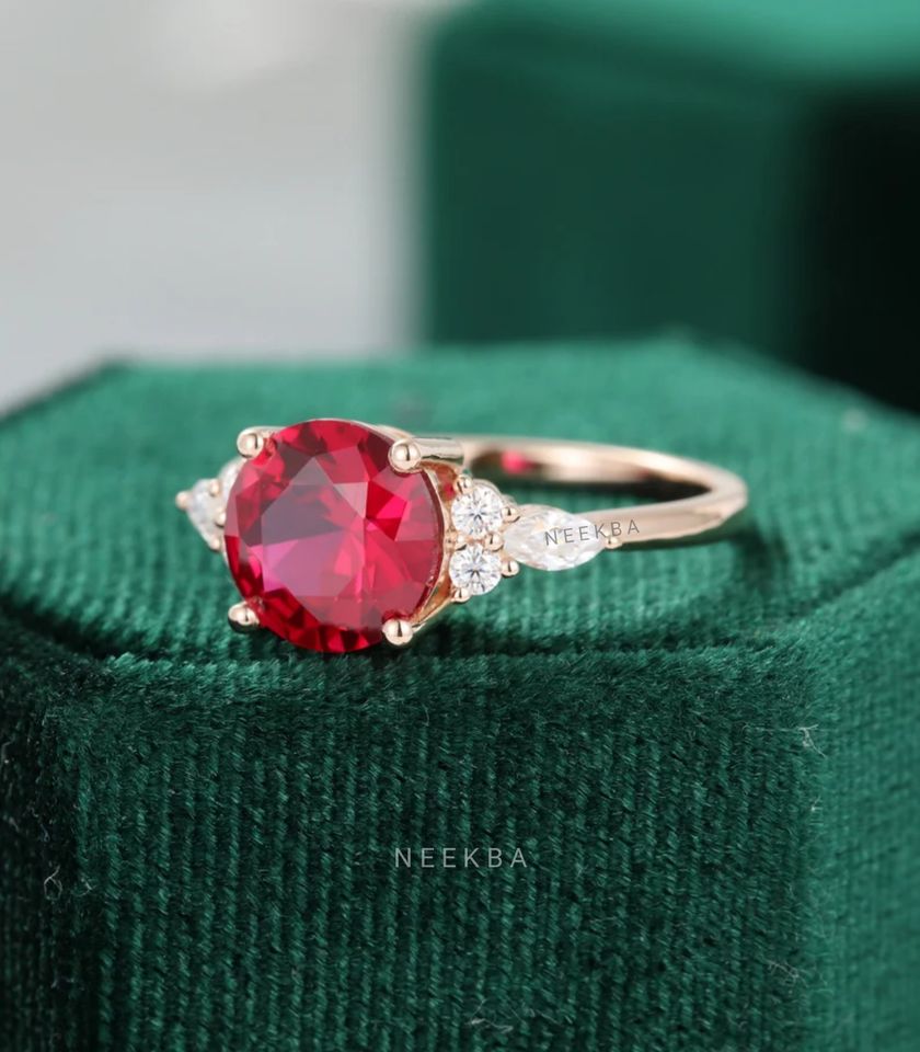 Anillo de oro macizo de 10K de corte redondo de 8 mm de rubí cultivado en laboratorio y moissanita Vintage Art Deco Cluster DE LA India-Opción de reemplazo de piedras preciosas