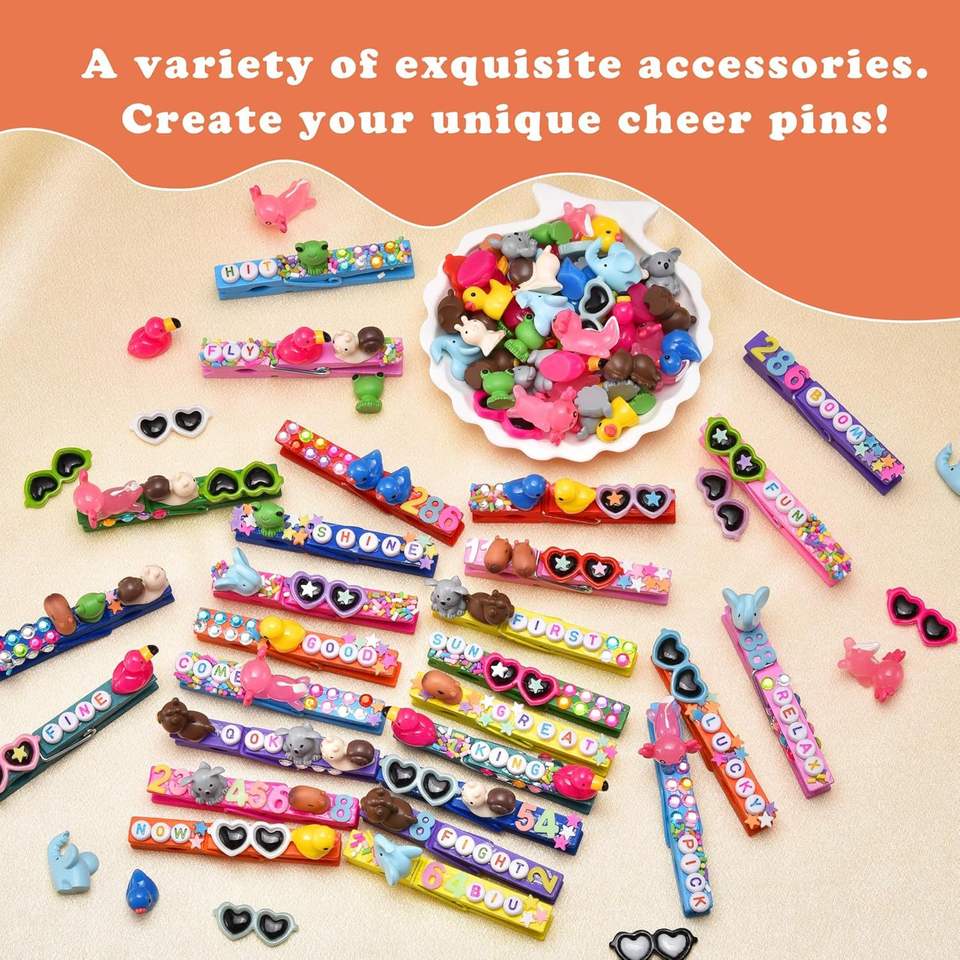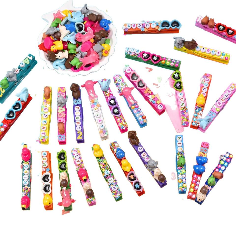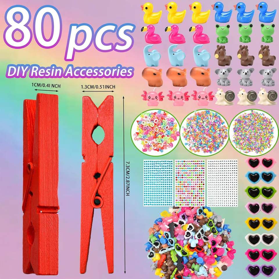 80 Piezas de Clips Decorativos para Animar el Espíritu, 80 Pinzas de Madera de Colores, Mini Animales de Resina, Lazos, Margaritas y Pegatinas, Cuentas y Perlas para Bolígrafos