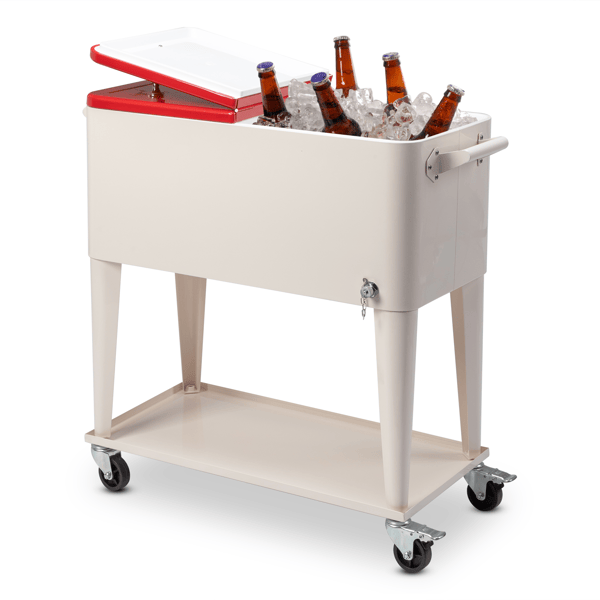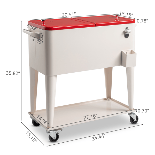 Nevera Portátil Rectangular de Plástico Blanco Lechoso de 80QT con Tapa Roja, 87.5*38.5*91cm, Patas de Hierro, Aislamiento para Congelador, Carro con Ruedas