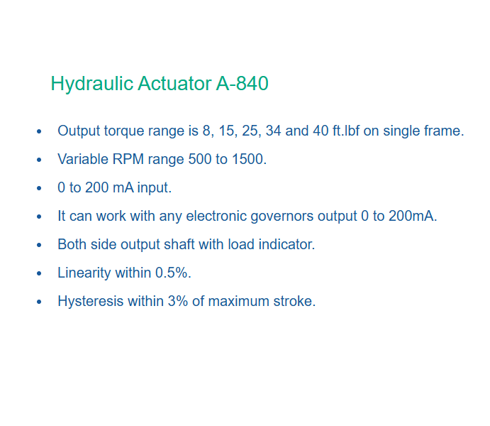 Actuador Hidráulico 840, Sistema de Control de Velocidad del Motor Compatible con Reguladores Electrónicos, Rango de Señal de Entrada de 0–200 mA