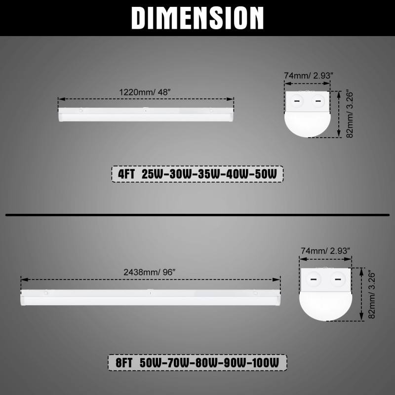 Tira de luz LED de 8 pies, 100W/90W/80W/70W/50W, CCT ajustable 2.7/3.5/4/5/5.7K, 120-277VAC, regulable 0-10V, luz LED para tienda