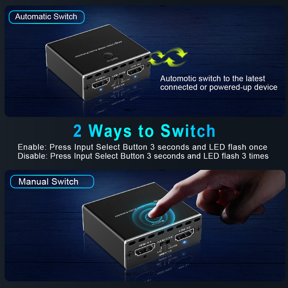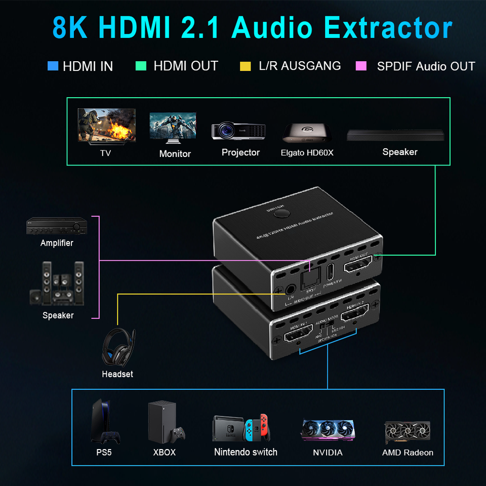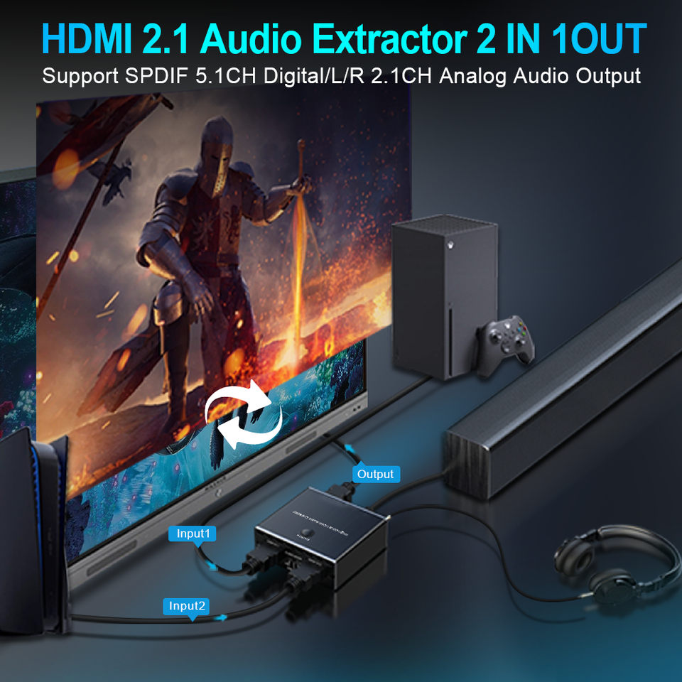 8K HDMI 2,1 Audio Extractor ARC 2 en 1 OUT CEC EDID HDMI Switch 2x1 para amplificadores PS5 Barras de sonido