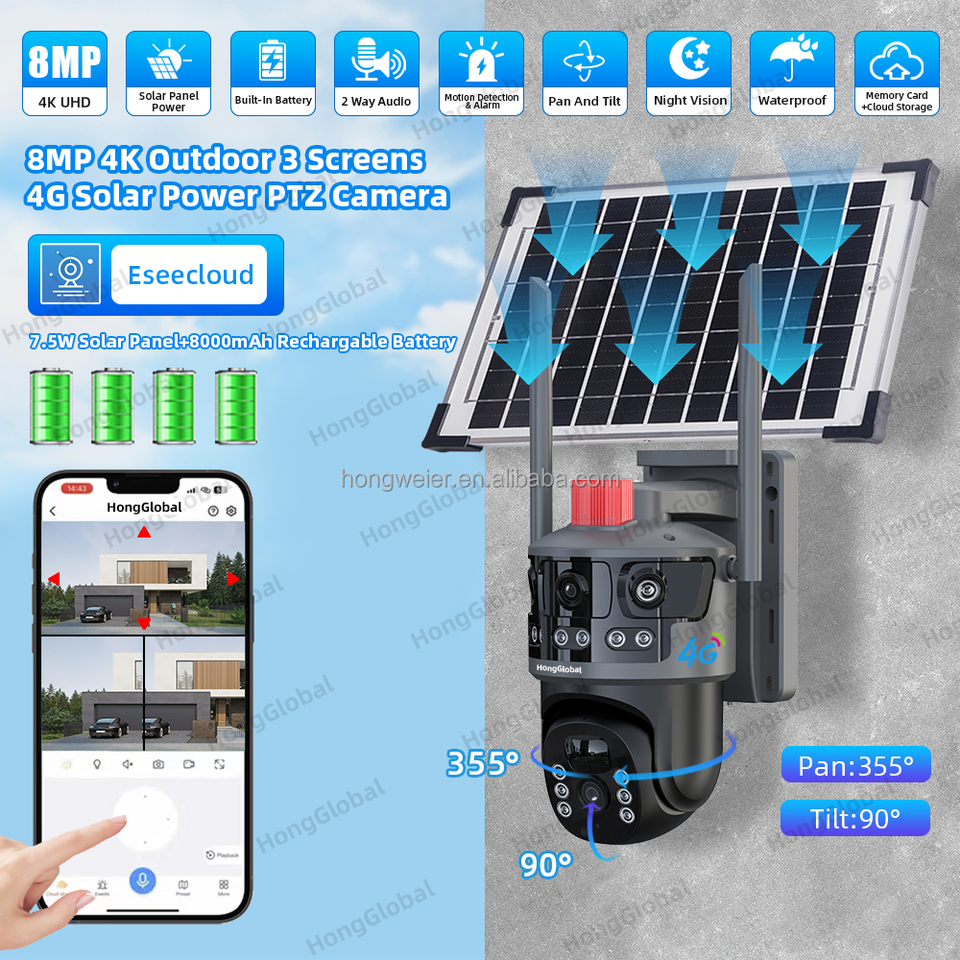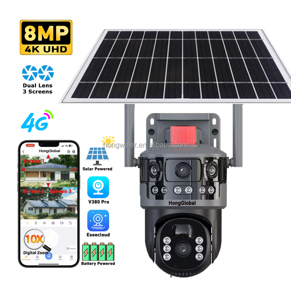 8MP 4K Eseecloud V380 Pro 3 pantallas de doble lente Solar inalámbrico PTZ cámara de vigilancia WiFi 4G tarjeta Sim CCTV Cámara Solar de seguridad