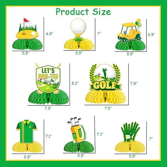 Nombre del Producto:8 Piezas Decorativas para Mesa de Fiesta de Golf, Centros de Mesa de Golf Amarillos con Diseño de Panal