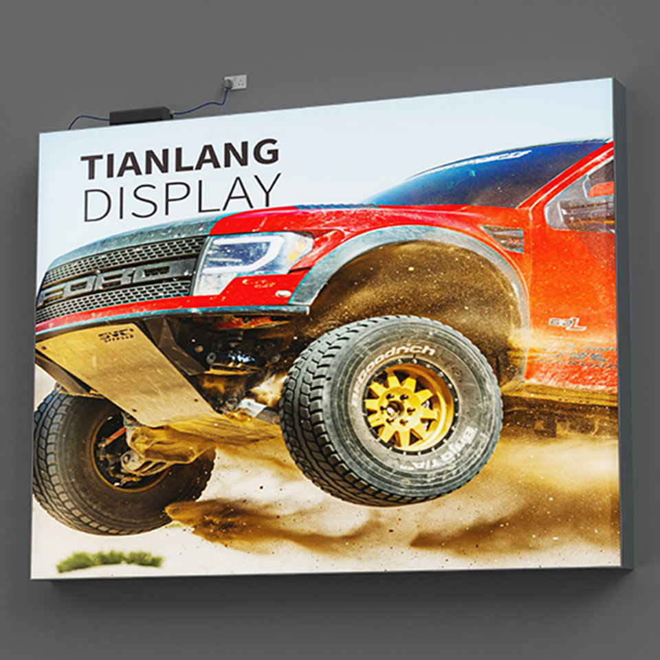 Caja de luz montada en la pared con retroiluminación LED A2 plateada, publicidad interior rectangular con marco de aluminio e instalación colgante de tela