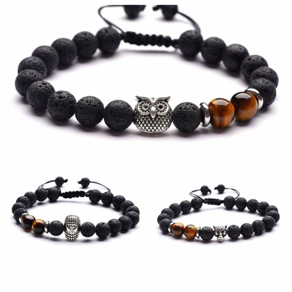 Pulseras de piedra de Lava de 8mm con ojo de Tigre, dijes de plata, cuentas de Buda de piedra volcánica, pulsera tejida con cuentas ajustables