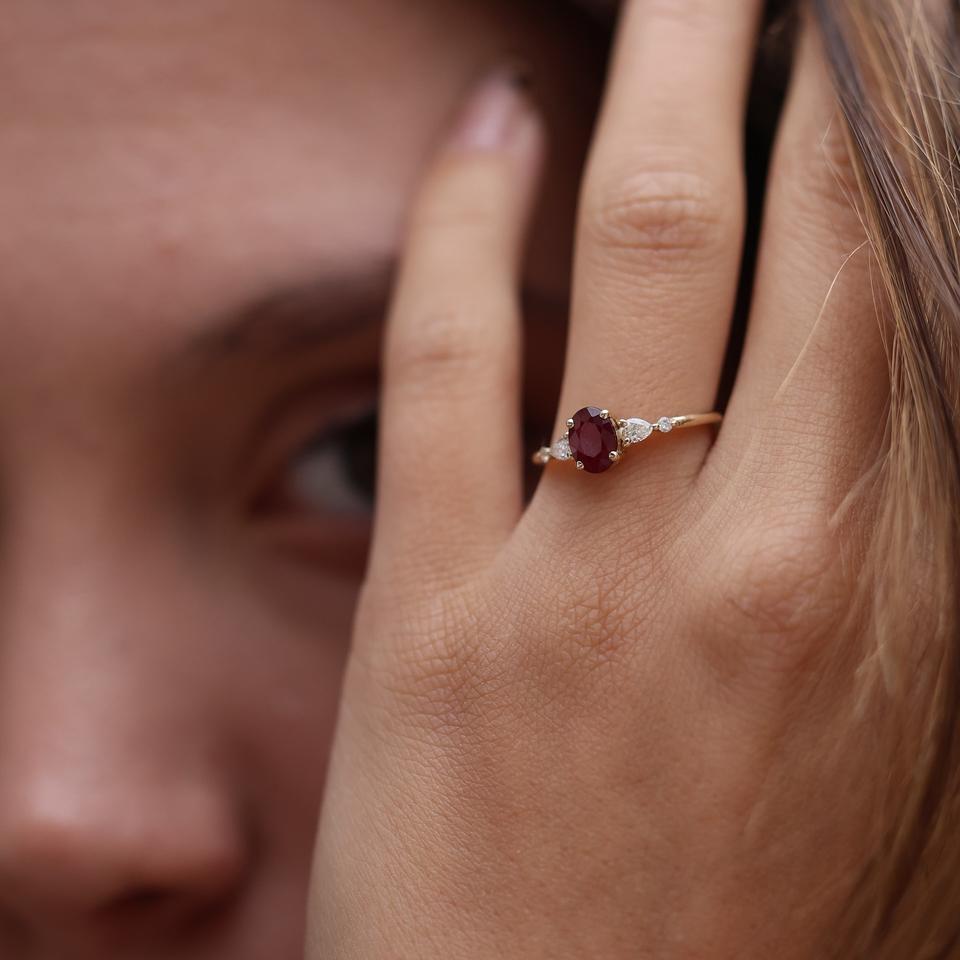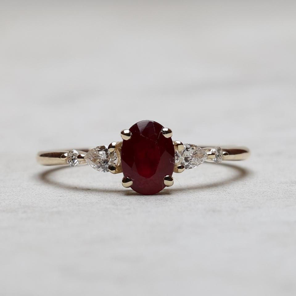 Anillo de compromiso de diamante CZ rojo de corte ovalado de 8x6mm, anillo de bodas de oro de tres piedras con piedras laterales de pera, chapado en oro de 18 quilates para regalo