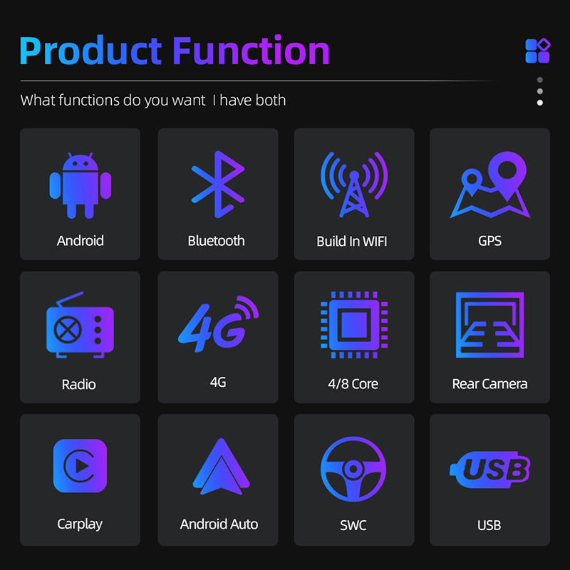 GPS, Estéreo, MANOS LIBRES, DSP, CarPlay, Enlace espejo, Android auto, Imagen en la imagen, Micrófono incorporado, Pantalla dividida, Administrador de archivos, Par de torsión, Coche de Control de volante, OtrosFunción