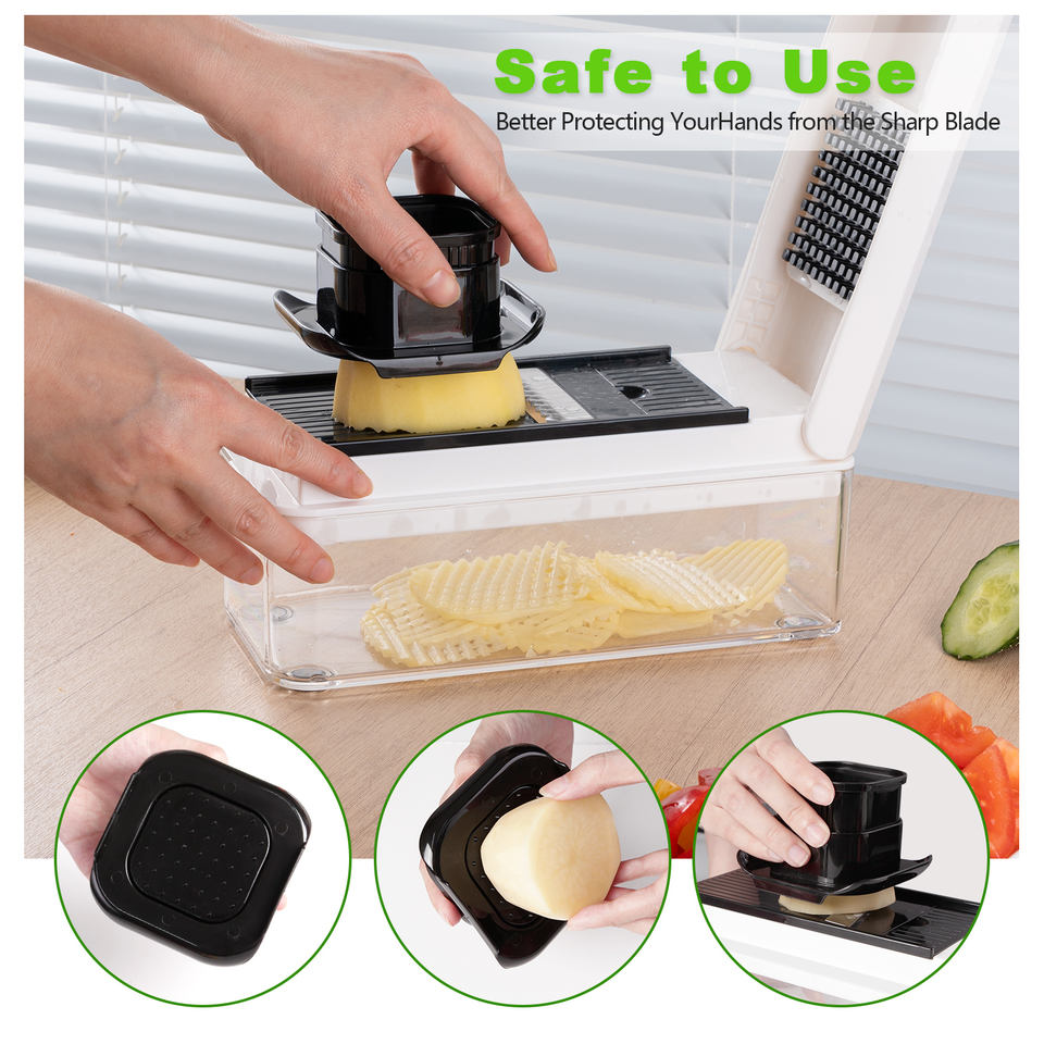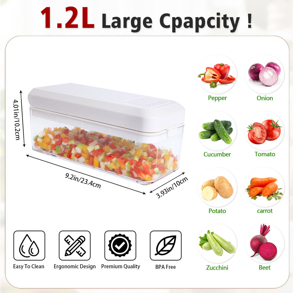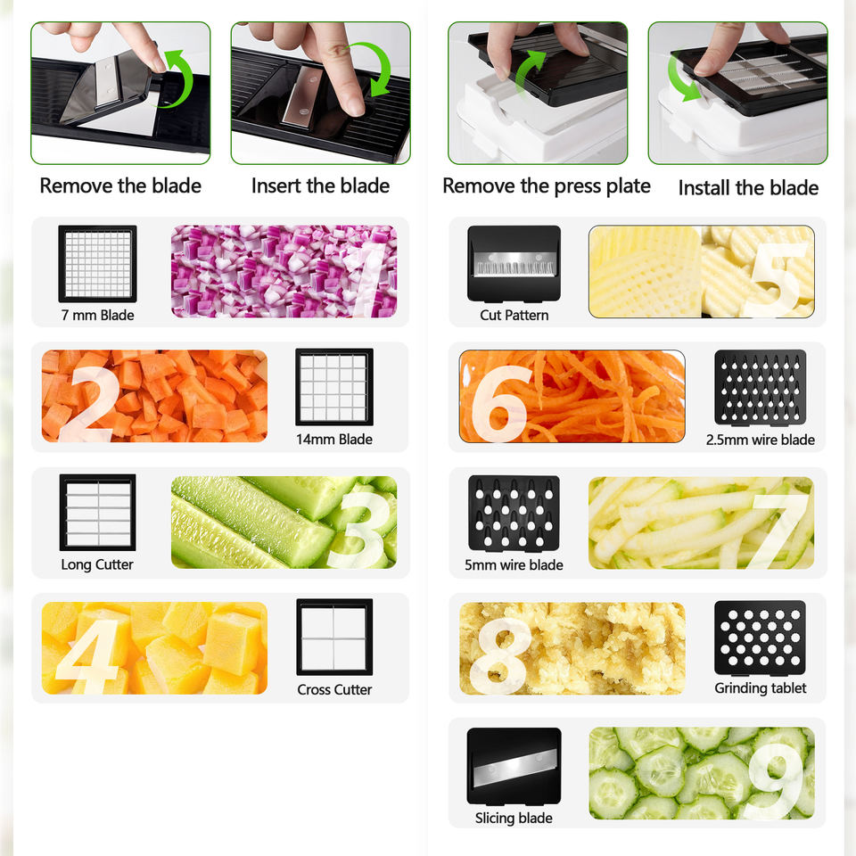 Picador de Verduras de 9 Cuchillas con Contenedor, Rebanador de Frutas, Cortador en Dados, Rallador, Utensilio de Cocina