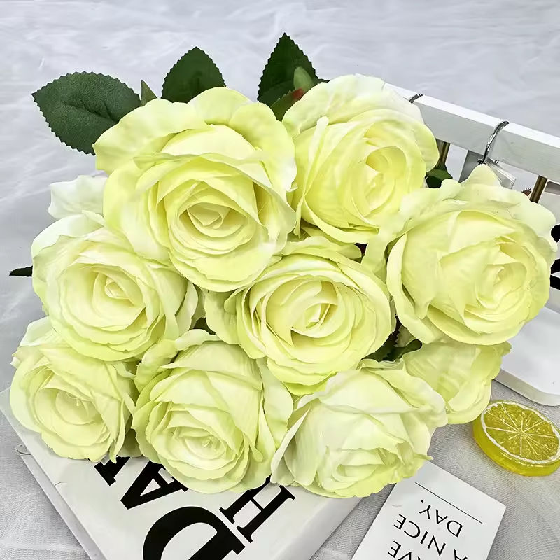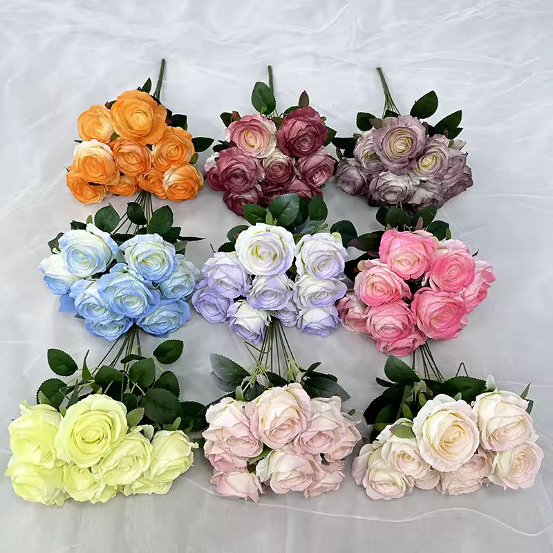 Ramo de 9 Rosas Artificiales con Bordes Quemados para Decoración Navideña, Año Nuevo Chino, Hogar, Bodas y Restaurantes
