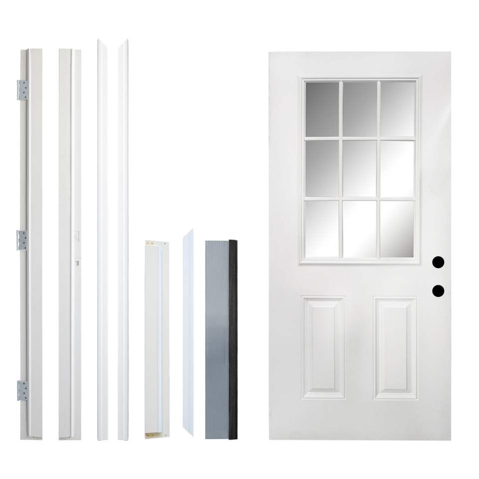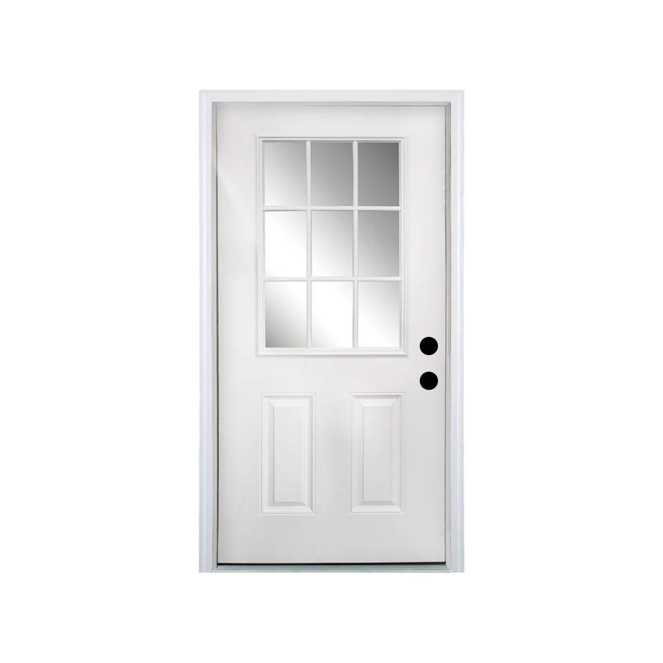 9 Lite Low-E Puerta de entrada frontal de vidrio 36X80 Fibra de vidrio Brickmould Marco de vinilo Roble blanco Grano de madera Knock-Down Door para frente