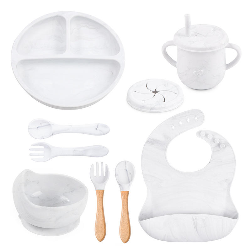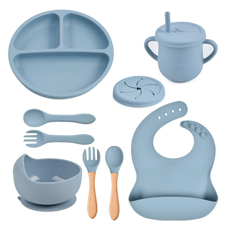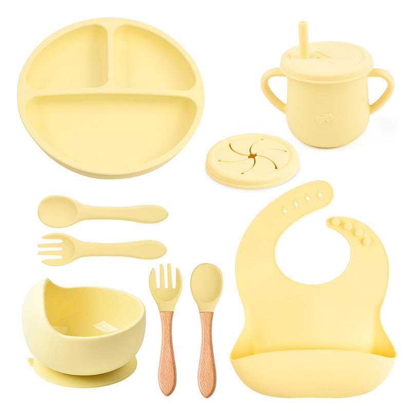 Juego de vajilla para bebé de 9 piezas, plato de silicona con diseño de carita sonriente, babero, tazón, cuchara, tenedor, taza, juego de alimentación de silicona para bebé