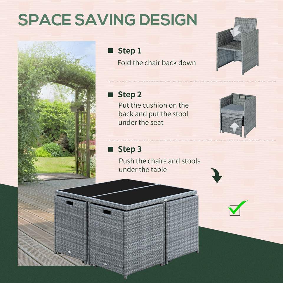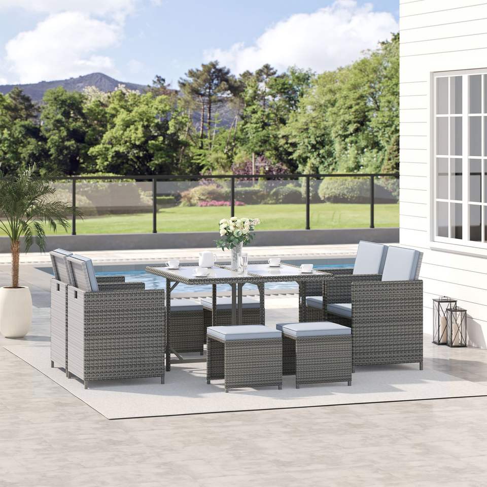 Juego de Muebles de Jardín de 9 Piezas, Mesa y Sillas de Mimbre Gris, Sillas de Mimbre Ahorradoras de Espacio con Cojines para Patio