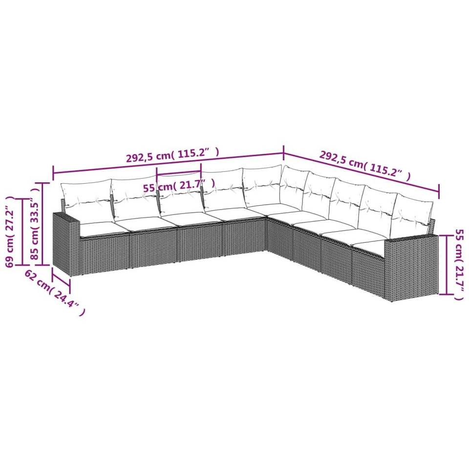 Juego de sofás de patio de ratán sintético gris de 9 piezas con cojines, muebles duraderos para exteriores