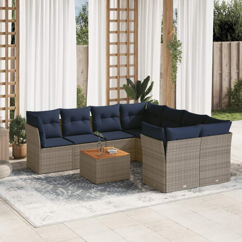 Juego de sofás de patio de ratán sintético gris de 9 piezas con cojines, conjuntos de jardín
