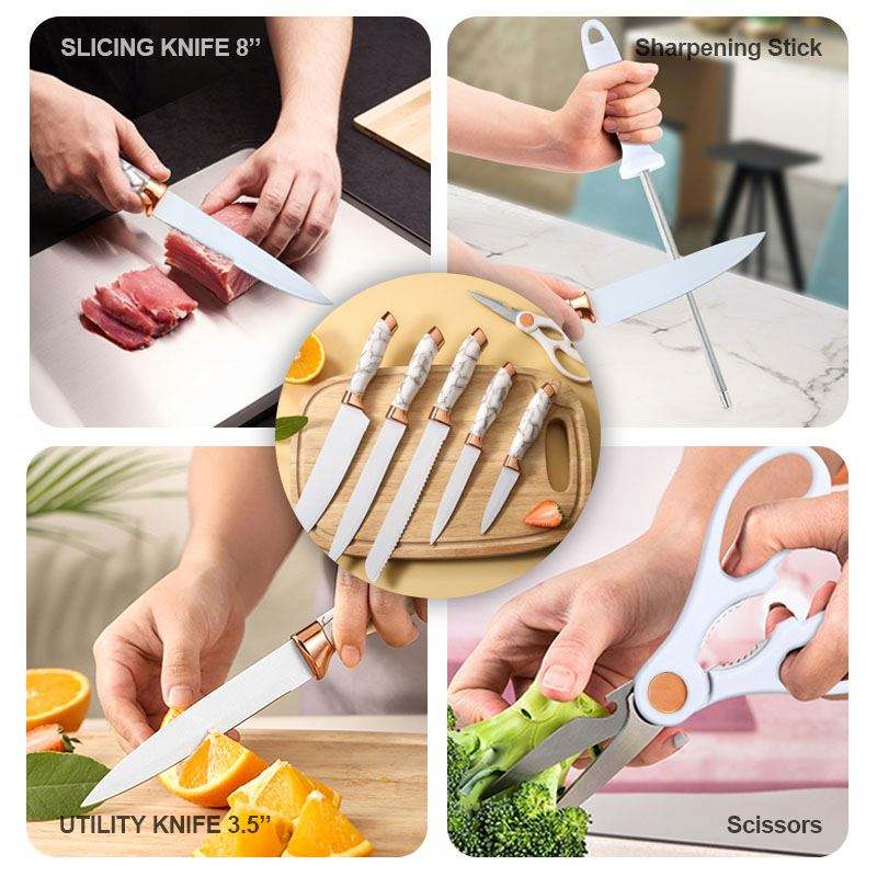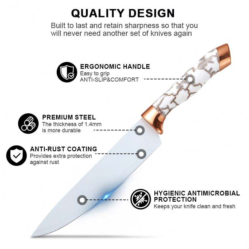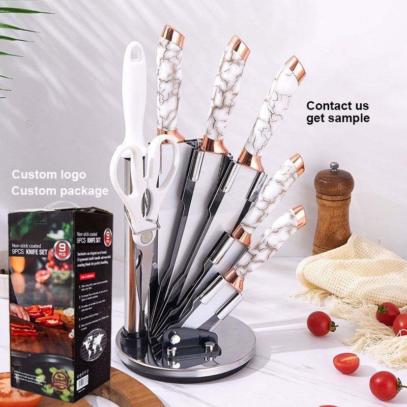 Juego de 9 Cuchillos de Cocina con Mango con Patrón de Mármol, Cuchillos de Acero Inoxidable para Cortar Carne, Pan y Verduras, con Soporte Giratorio de Acrílico