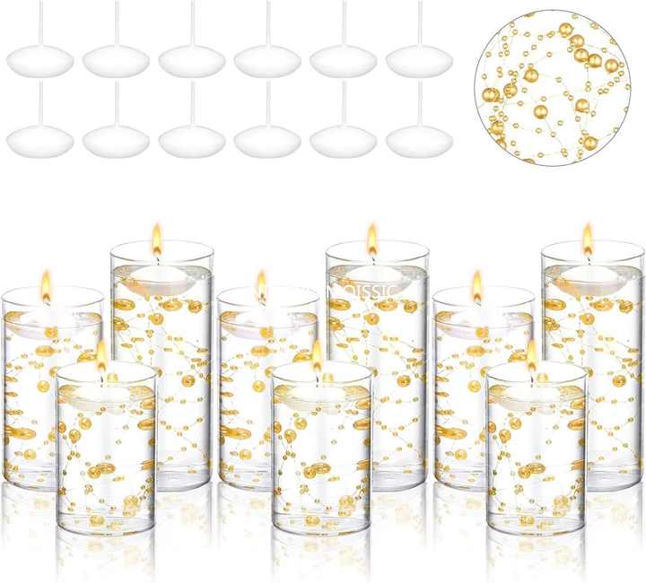 Juego de 9 jarrones cilíndricos de vidrio, centros de mesa, candelabro transparente de huracán de varios tamaños con velas flotantes para decoración de mesa de boda