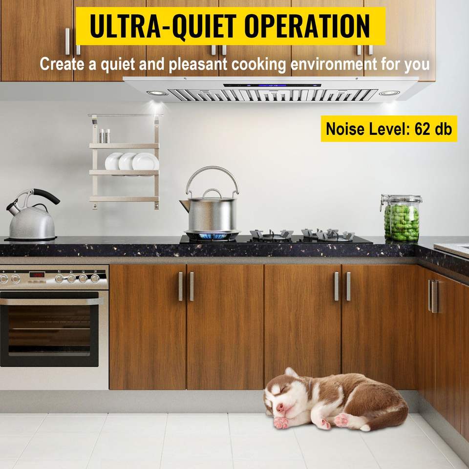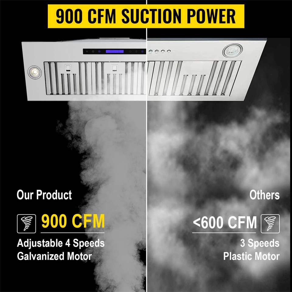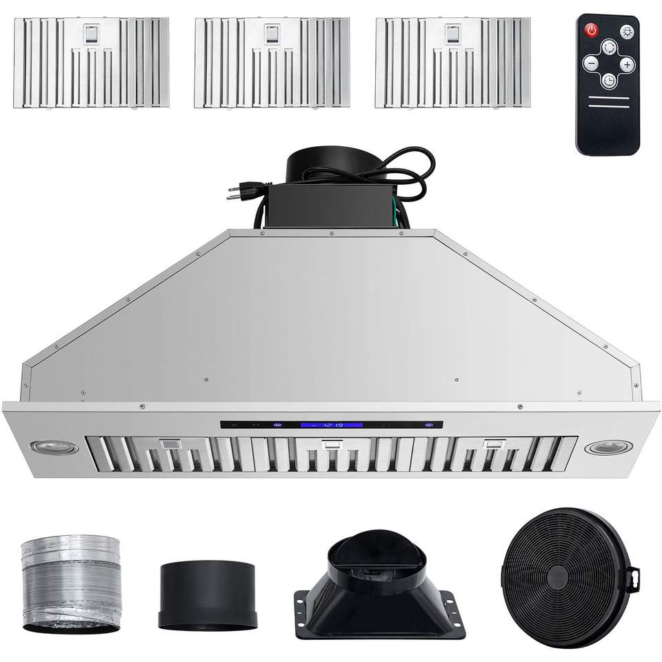 Campana extractora empotrada de 36 pulgadas de acero inoxidable con 4 velocidades, 900 CFM, control táctil remoto y luces LED, con deflector