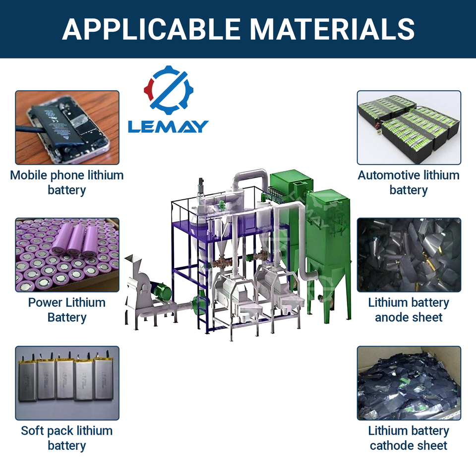 900 kg/h Planta de reciclaje de batería de iones de litio Línea de reciclaje de batería de teléfono Máquina de reciclaje de batería de iones de litio