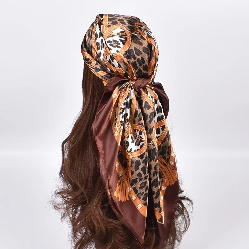 Pañuelo Cuadrado de Seda de 90cm con Cadena de Colores para Mujer, Pañuelos de Moda con Estampado de Leopardo, Pañuelo para la Cabeza, Chal