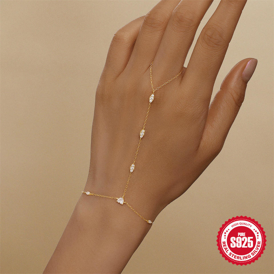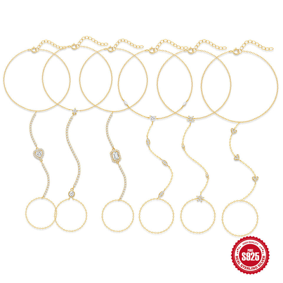 925 Cadena de dedo de plata Pulsera de mano joyería 18K chapado en oro Zirconia cúbica enlace anillo pulseras esclavo pulsera para mujer