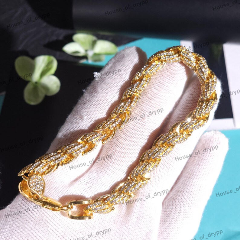 Pulsera de Cadena de Cuerda Trenzada Ajustable de Plata 925 con Diamantes Moissanite para Mujer, Pulsera de Lujo Chapada en Rodio Estilo Hip Hop