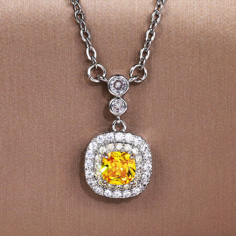 Collar con Colgante de Topacio Amarillo Chapado en Rodio sobre Plata 925 con Cadena de Eslabones con Halo de Diamantes, Joyería Clásica para Mujer para Uso Diario