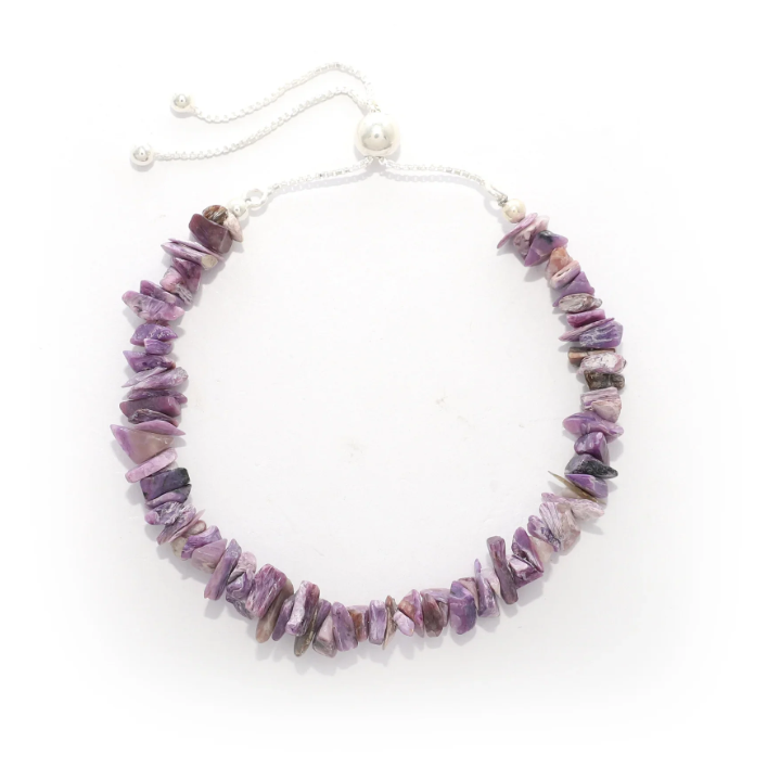 Brazalete fino de Plata de Ley 925 Charoite Rough Cut Bolo Bracelet con ajuste de alambre flexible suave Regalo para mujeres en caja de regalo