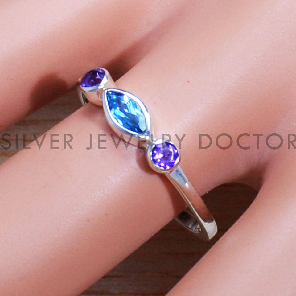 Anillos Pequeños de Plata de Ley 925 con Topacio Azul Natural y Amatista, Anillo con Tres Gemas Facetadas, Precio al por Mayor, Anillos y Joyería
